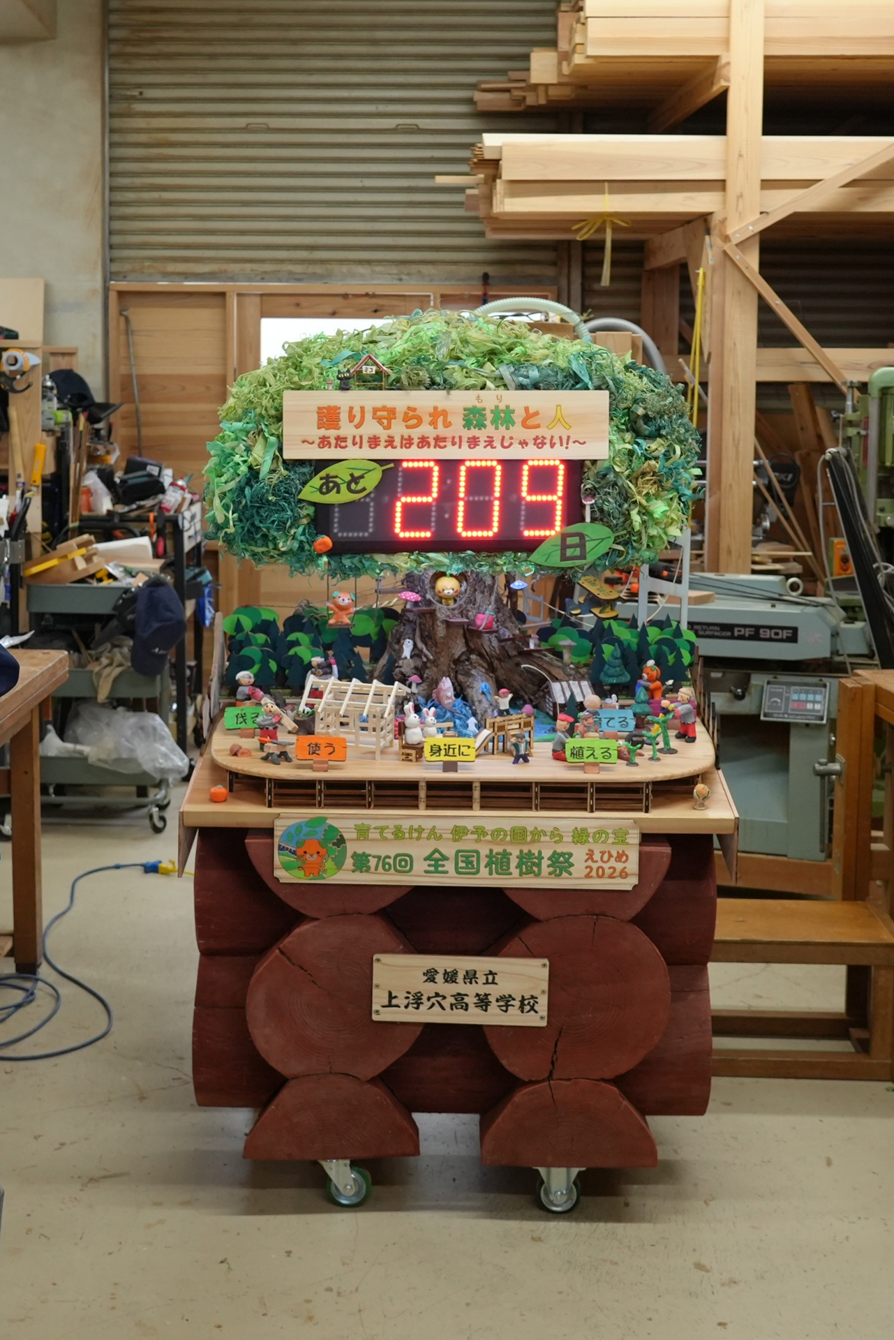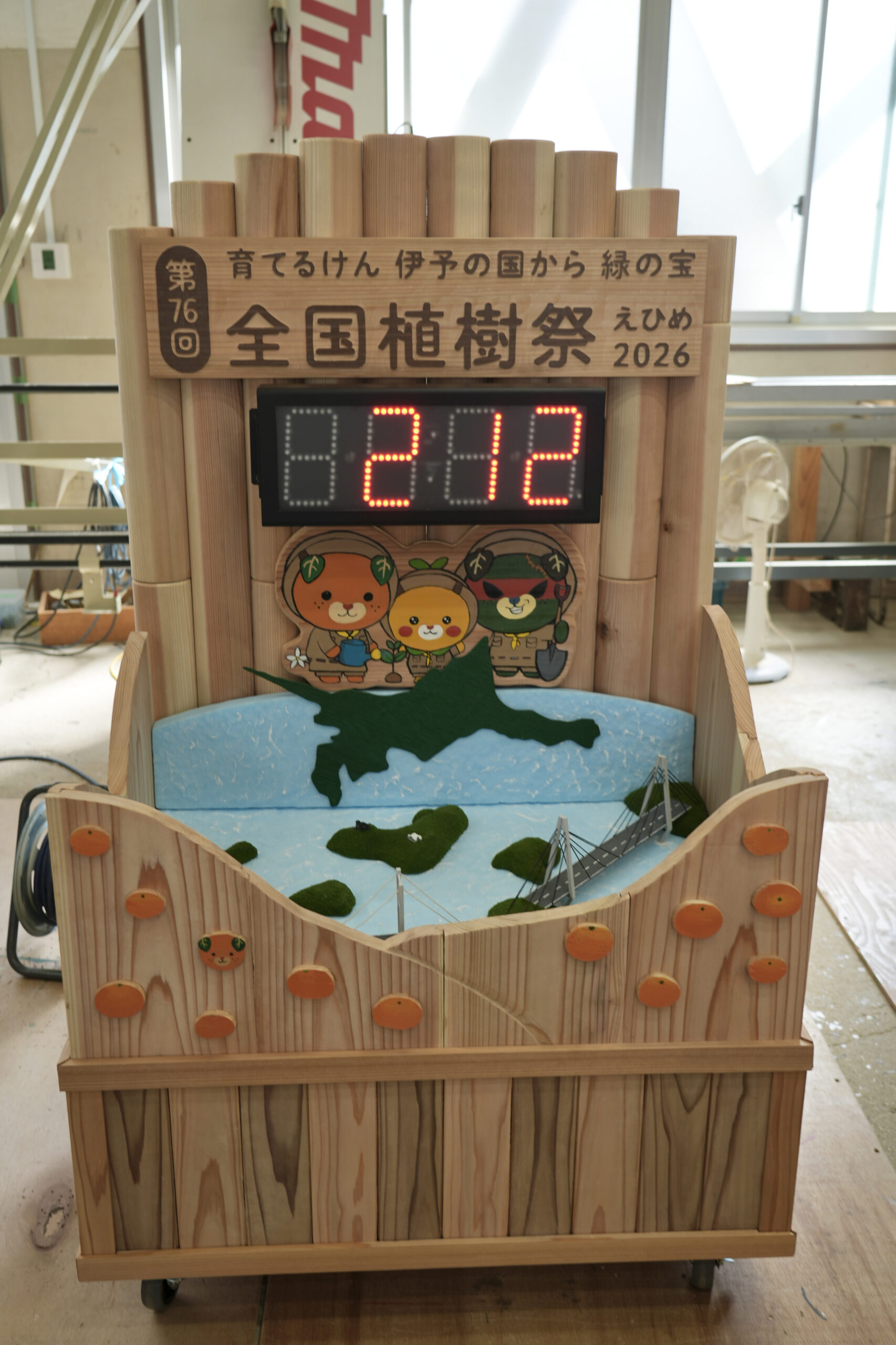 「第76回全国植樹祭えひめ2026」開催までの残り日数をお知らせするカウントダウンボードを、県内の高校生の皆さんに、愛媛県産木材を使ってデザインから制作まで行っていただきました。