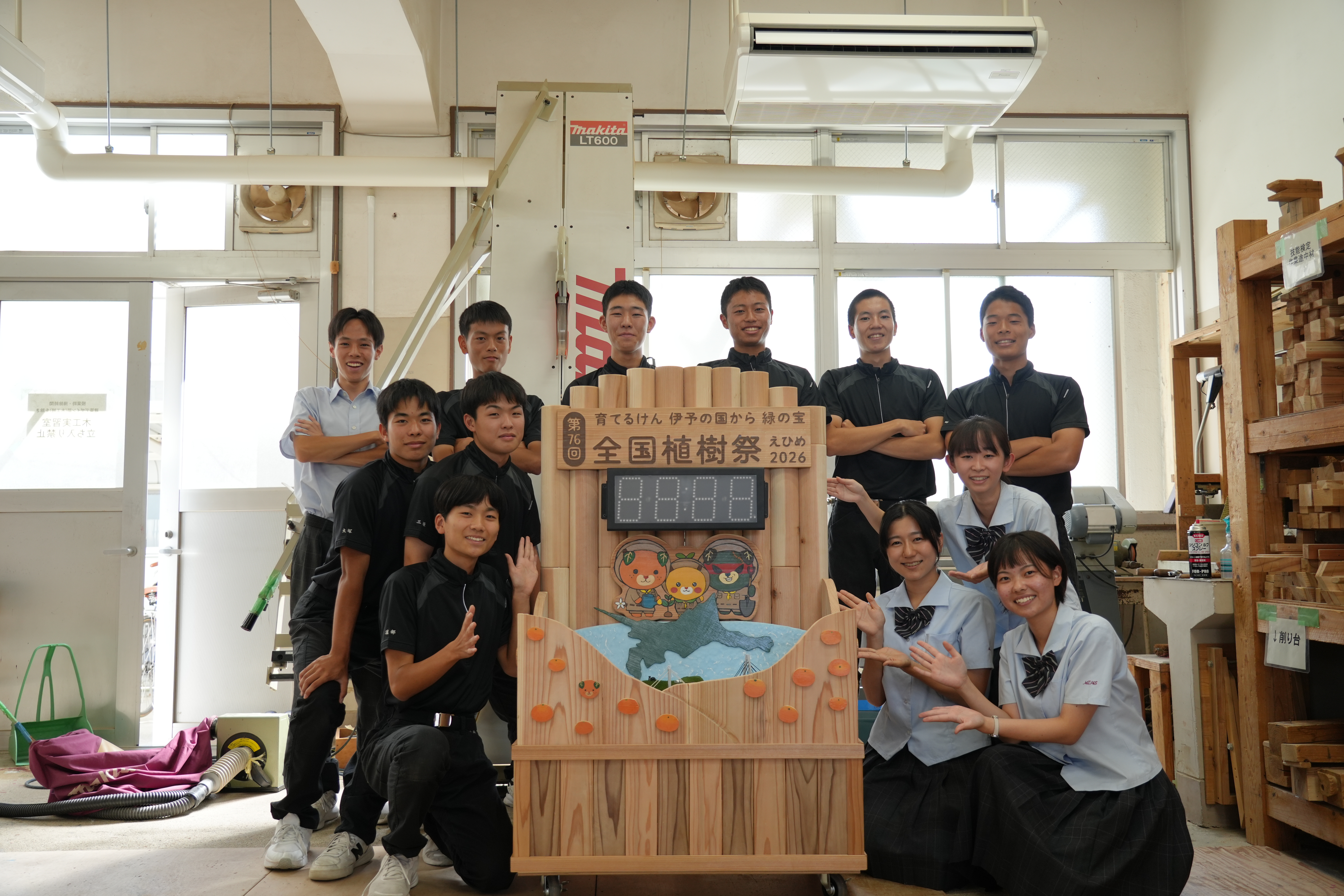 「第76回全国植樹祭えひめ2026」開催までの残り日数をお知らせするカウントダウンボードを、県内の高校生の皆さんに、愛媛県産木材を使ってデザインから制作まで行っていただきました。
