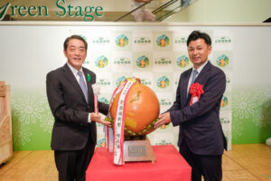 第76回全国植樹祭実行委員会会長の中村知事から松前町の田中町長に木製地球儀が手渡されました。