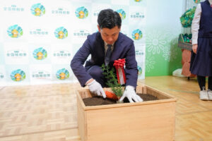 今回記念植樹を行った苗木は、松前町立松前中学校の生徒の皆さんが「苗木のスクールステイ」で育てたヒノキです。