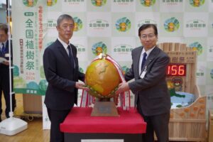 引渡し式では、愛媛県東予地方局の河上局長から西条市の高橋市長に木製地球儀が手渡されました。