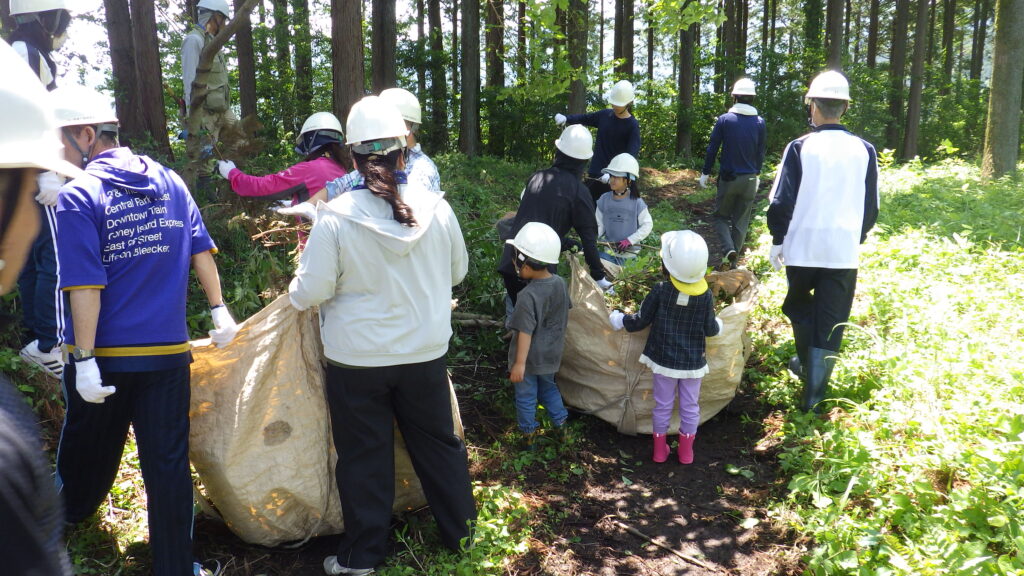 | 社員及びその家族28名の参加を得て、伐採作業の見学や灌木の刈り払い、枝葉の片づけの補助作業などを実施し、全国植樹祭のPRも行われました。 | |