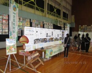 | 地産・地消による地球温暖化防止活動の普及啓発のため、石城地区文化祭で原木きのこ栽培に関する展示が行われました。 |