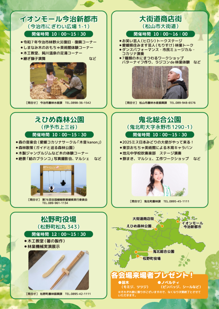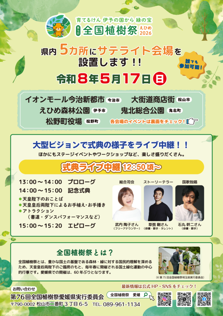 2026.04.17 お知らせ 第76回全国植樹祭えひめ2026 サテライト会場について 多くの方に大会を身近に感じていただくため、大会当日の5月17日(日)、県内5か所にサテライト会場を設置し、式典ライブ中継や森林・林業に関する様々なイベントを実施しますので、お知らせします。 【プレスリリース】第76回全国植樹祭えひめ2026サテライト会場について 前の記事へ 一覧 次の記事へ